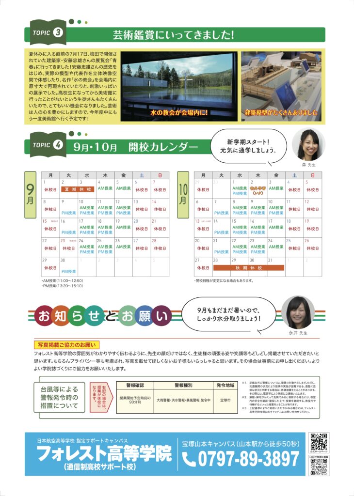 フォレスト通信(9月号/ウラ) 2025 9/14 ブログ 2025年9月10日2025年9月14日 ブログ URLをコピーしました! URLをコピーしました! フォレスト通信(9月号/オモテ) 【中3生のみなさんへ】来年度の入学に向けた相談・見学会を実施中! 関連記事 11月の開校時間につきまして 2025年11月1日 【おすすめ記事】ことばに頼らない親子コミュニケーション 2025年10月31日 【読んでおきたい記事】不登校の小中学生、初の35万人超 増加率は低下 2025年10月29日 【重要】高3生で転入をご検討の生徒さま・保護者さまへ 2025年10月22日 【おすすめ記事】保護者の不安の言葉が、子どもの自己肯定感を下げる? 自信を取り戻すために必要な親の態度とは 2025年10月13日 フォレスト通信(10月号/ウラ) 2025年10月11日 フォレスト通信(10月号/オモテ) 2025年10月9日 【気になる記事】高校授業料無償化、自公維が協議/定住外国人も支援/留学は対象外 2025年10月7日