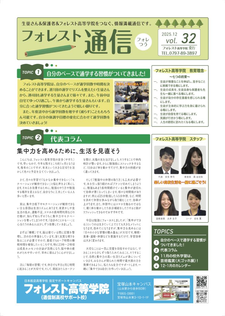 フォレスト通信(12月号/オモテ) 2025 12/03 ブログ 2025年12月2日2025年12月3日 ブログ URLをコピーしました! URLをコピーしました! 12月の開校時間につきまして 関連記事 12月の開校時間につきまして 2025年11月29日 【おすすめ講演会/参加無料】不登校の子を持つ保護者さま向け座談会🌿 不登校・行き渋りに悩む親が”自身を大切にする時間”を持つために 2025年11月22日 【最終のご案内/高3生向け】60単位取得済みであれば、来年3月に高校卒業が可能です! 2025年11月19日 フォレスト通信(11月号/ウラ) 2025年11月10日 フォレスト通信(11月号/オモテ) 2025年11月8日 【読んでおきたい記事】オンライン学習で「出席」扱い 不登校児の6割知らず 周知に課題 2025年11月6日 【高1〜3生のみなさんへ】転入に向けた相談・見学会を実施中! 2025年11月3日 【中3生のみなさんと保護者さまへ】来年度の新入学選考スタート! 2025年11月2日